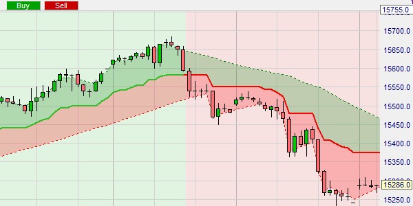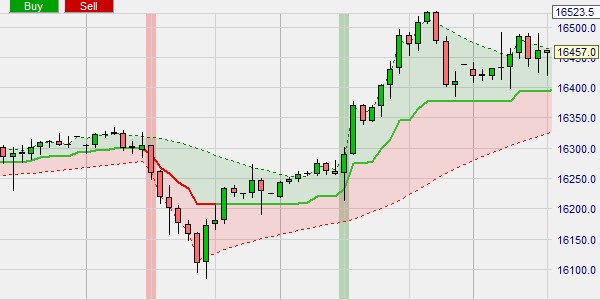 Dieses Beispiel zeigt eine Stop-Loss-Order, die automatisch dem Kanal folgt. Eine Position wurde gekauft (grünes Dreieck). Mit Hilfe des TradeGuard in der NanoTrader-Plattform folgt die Stop-Loss-Order automatisch dem gegenüberliegenden Band. Die Position wurde geschlossen, als der Marktpreis das untere Band berührte. Bei starkem Trend hat sich dieses Band als gutes Niveau für den Ausstieg aus einer Position erwiesen.