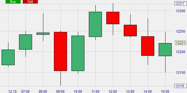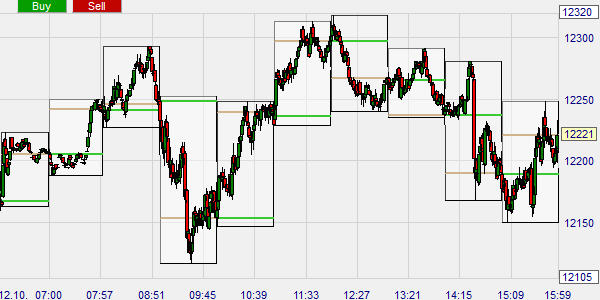 Im Chart unten wird das Prinzip am DAX dargestellt: 1-Minuten-Kerzen erscheinen innerhalb einer 60-Minuten-Kerze (1 Stunde). Eine grüne Linie kennzeichnet den Eröffnungskurs der 60-Minuten-Kerze. Eine beigefarbene Linie zeigt den Schlusskurs, bei einer noch laufenden Kerze den aktuellen Marktpreis.