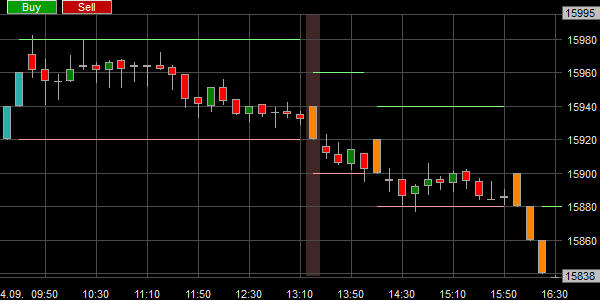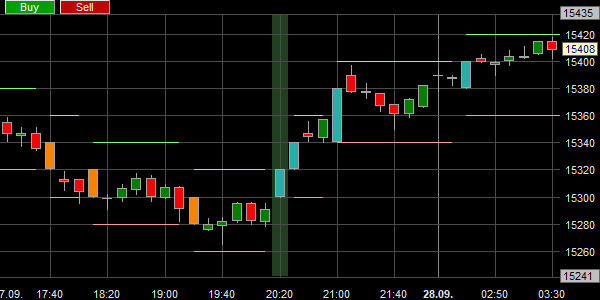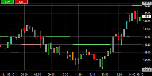 Ein Beispiel zeigt ein Kaufsignal für den DAX Index: Auf einen roten Renko Block folgt ein grüner Renko Block.