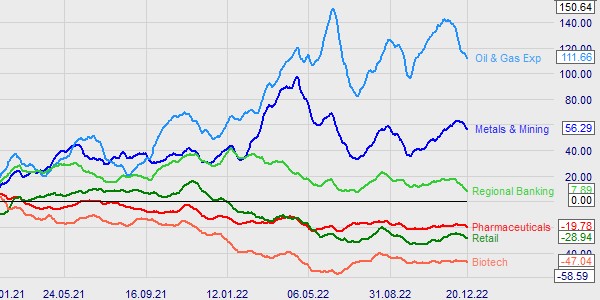 Dieses Beispiel zeigt die Renditen von sechs Sektoren über zwei Jahre. In diesem Zeitraum liegt die Erdöl- und Erdgasexploration mit +111,66 % vorn. Der Biotech-Sektor ist in diesem Beispiel mit -47,04 % der schwächste Sektor.