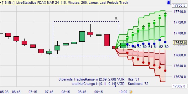 Ein Beispiel zeigt den DAX: Die acht Kerzen decken den Zeitraum von 8.00 Uhr bis 10.00 Uhr ab und bilden damit den Beginn des DAX-Marktes. Dieses Eröffnungsmuster trat in der Vergangenheit 31 Mal auf (Hinweis: maximale Chartlänge laden). Das Sentiment liegt bei 72, wodurch eine Tendenz zu steigenden Kursen nach diesem Muster sichtbar wird. Dunkelgrüne und rote Zonen markieren die am häufigsten auftretenden Szenarien, wobei der Aufwärtstrend mehr Potenzial zeigt.