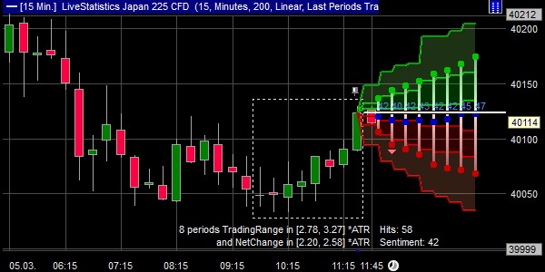 Ein Beispiel mit dem japanischen Nikkei-Index betrachtet den Zeitraum von 9.45 Uhr bis 11.45 Uhr. Nach einem Anstieg in den letzten zwei Stunden wirkt ein Einstieg naheliegend. LiveStatistics liefert jedoch eine Gegenperspektive: 58 ähnliche Muster sind historisch aufgetreten, das Sentiment liegt bei 42 und gilt als bärisch. Die blauen Punkte stehen vertikal, die Spannen bleiben begrenzt. Die Statistik deutet damit eher auf eine Seitwärtsbewegung nach dem Muster hin. Eine Kaufidee sollte in diesem Szenario erneut geprüft werden.