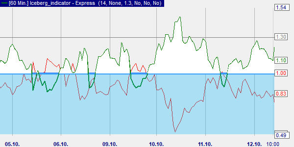 Der Vortex Iceberg Indikator folgt konzeptionell demselben Ansatz wie der Vortex, nutzt jedoch eine andere Darstellung. Verwendet werden nur die Spitzen sowie die Kreuzungen mit der Mittellinie. Daraus ergibt sich eine Darstellung als Eisberge, die aus dem Meer, also der Mittellinie, herausragen. Sichtbar sind ein positiver VI+ und ein negativer VI- Iceberg.