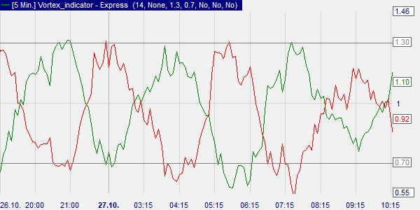 Der Vortex ist ein Oszillator. Gemeint ist ein Indikator, der steigt und fällt. Der Vortex besteht aus zwei Linien: einer grünen Linie (VI+, positiv) und einer roten Linie (VI-, negativ). Nach Siepman und Bote liegt ein positiver, steigender Trend vor, wenn VI+ oberhalb von VI- verläuft. Umgekehrt gilt der Trend als negativ, wenn VI- unterhalb von VI+ liegt.
