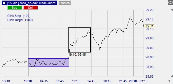 Nach dem Ausbruch ist zu erkennen, dass der MINI S&P sich besser entwickelt als der MINI DAX. In diesem Fall bietet sich für den Trader die Gelegenheit, den Mini S&P zu verkaufen und DAX zu kaufen (Pairs Trading). Denn wir gehen davon aus, dass sich die Marktpreise einander erneut annähern werden. Denken Sie daran, dass sowohl die Long-Position als auch die Short-Position in Bezug auf den Geldwert ähnlich groß sein sollten. Wenn Sie Mini S&P im Wert von 1000 $ shorten, sollten Sie auch Mini DAX im Wert von 1000 $ kaufen.