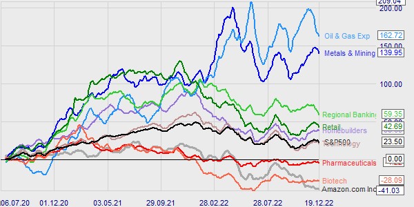 Dieses Beispiel zeigt die Renditen von sechs Sektoren über zwei Jahre. In diesem Zeitraum liegt die Erdöl- und Erdgasexploration mit +111,66 % vorn. Der Biotech-Sektor ist in diesem Beispiel mit -47,04 % der schwächste Sektor.