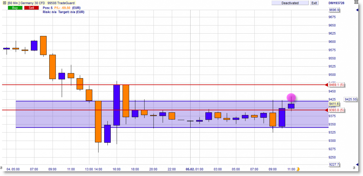 Break.Out Trade auf dem DAX mit dazugehörigen Stop und Limit Levels.