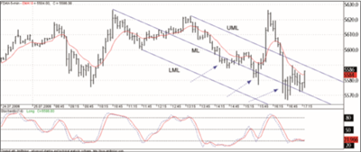 Bild 9. Idealer Zeitpunkt für die Berührung der Median-Line. In einer Aufwärtsbewegung kann man an der eingezeichneten Pitchfork eine Fibonacci-Time-Extension ansetzen. Der Anfangspunkt und der untere Umkehrpunkt der Pitchfork sind die Basis. Hierbei sollte dann die Berührung zwischen 61 und 100 Prozent geschehen. In diesem Bereich sind die Chancen hoch, dass ein deutlicher Widerstand an der Pitchfork entsteht.